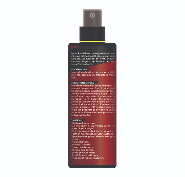 Fast-acting, Tecza Instashine finish designed to remove mud, dirt and debris from matte finishes. Specially blended surfactants and detergents lift away solids without sticking to the surface, leaving the surface clean and residue-free. Non-toxic, non-flammable and eco-friendly formulation contains no harmful acids, Cleans and protects Shine finishes Adds gloss or shine Removes dirt, dust, road grime, fingerprints and more